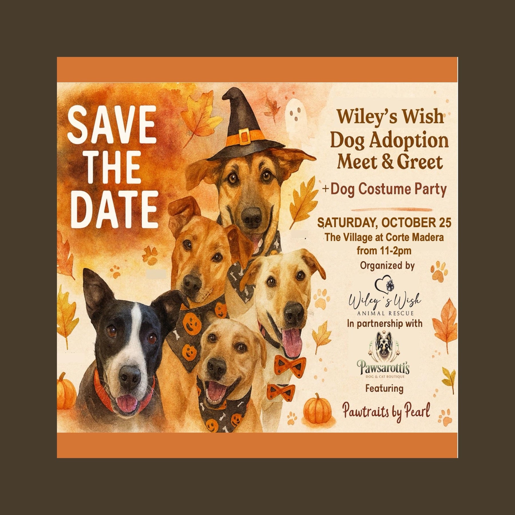 Mark your calendars for Saturday, October 25 from 11-2PM in the Center Court at The Village at Corte Madera! Come say hello to our trained rescue dogs ready for adoption. Visit our partner, Pawsarotti’s Dog & Cat Boutique, to shop unique pet items or purchase a hand-painted print of your pet on site with Pawtraits by Pearl!